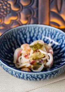 Il mio lavoro è prevalentemente con ingredienti del territorio, cercando di effettuare accostamenti di terra e mare al fine di trasmettere un abbinamento equilibrato tra sapidità, dolcezza e creatività.